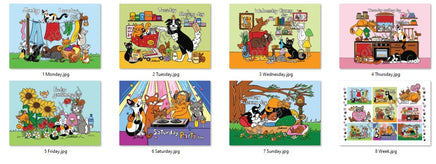 You will receive 8 postcards - each depicting an image for a specific Day of the week + additional postcard showing all days.