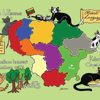 Titina and Friends learning about Lithuania. A colorful map in the author's view, with some cats designed near and also some famous words and icons from Lithuania.